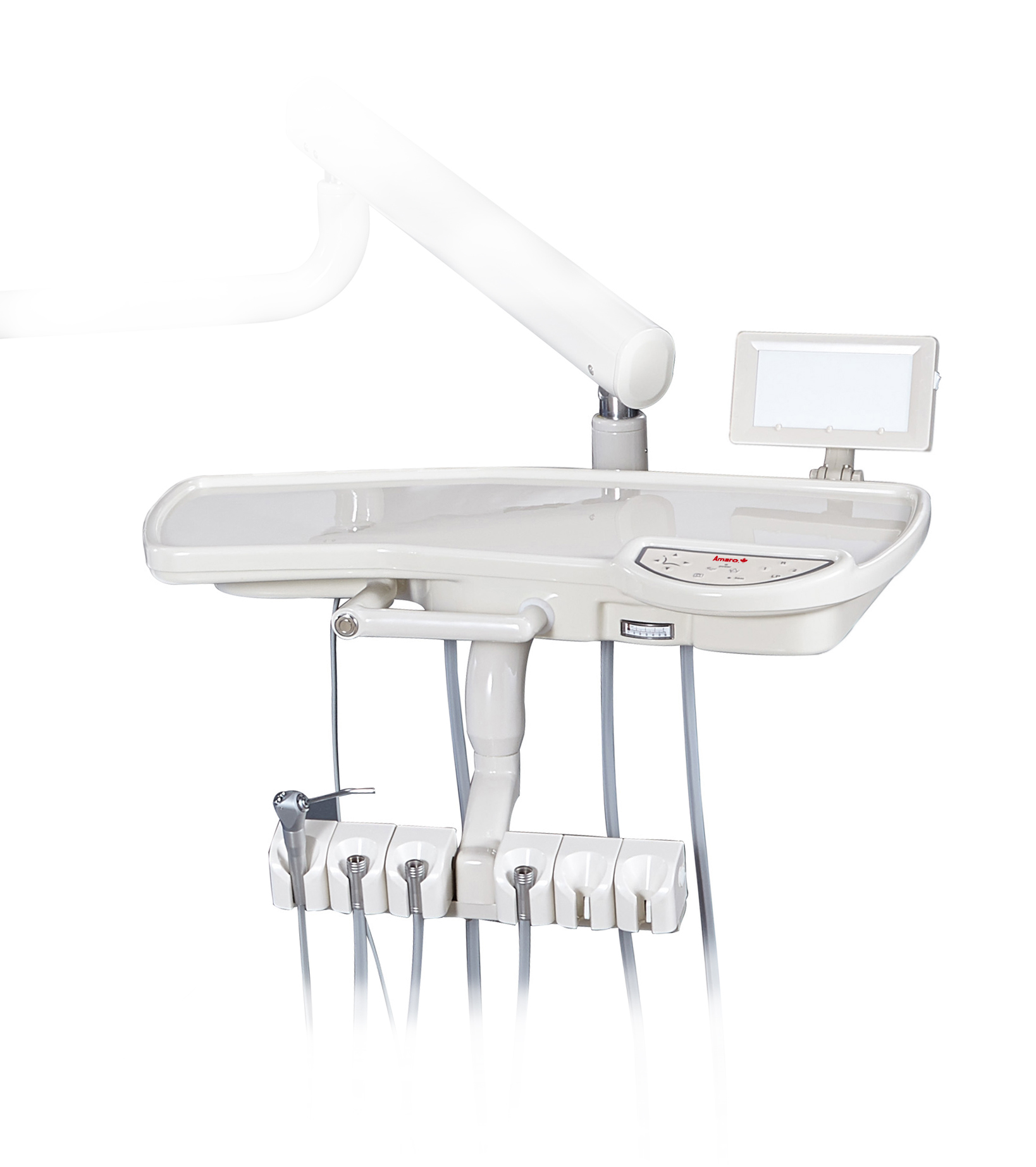 La bandeja de braket Amaro Stronger, esta pensada para los usuarios que desean una bandeja amplia , liviana y de buen diseño. Cuenta con terminales para dos turbinas, micromotor y un espacio libre para instalar una lámpara fotocurado, scaler ultrasonido, cámara intraoral, dependiendo del usuario. Cada pieza de mano cuenta con llave de regulación tanto como de aire y agua.